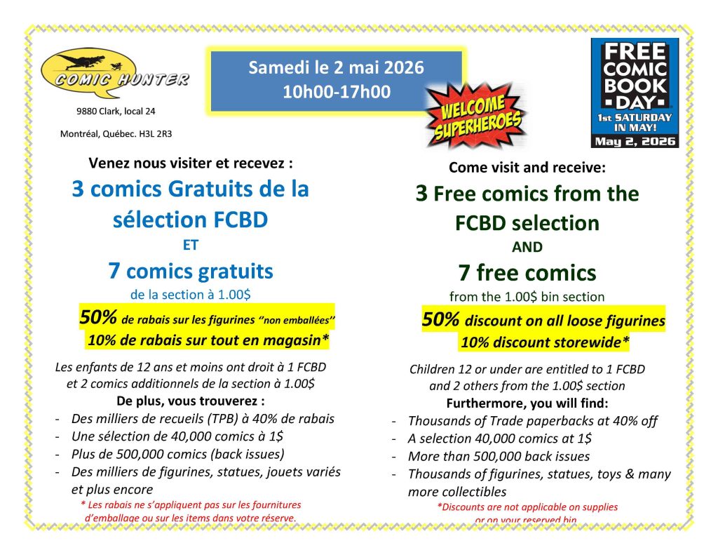 At Comic Hunter, we have a pull list system where you can preorder your comics/trade paperbacks/figurines two months in advance. While doing so, you ensure that you will receive your comics on time on their release date. We also offer you a 15% discount on most preordered items as well as free bags and boards for your comics. Taxes are on us! If you need to add anything on your pull list, you can fill out this form and send it to us by email.